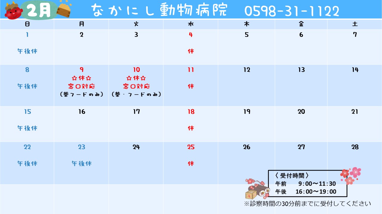 ・9日(月) 9:00~12:00、16:00~18:30 窓口対応のみ (フード・薬のお渡し)